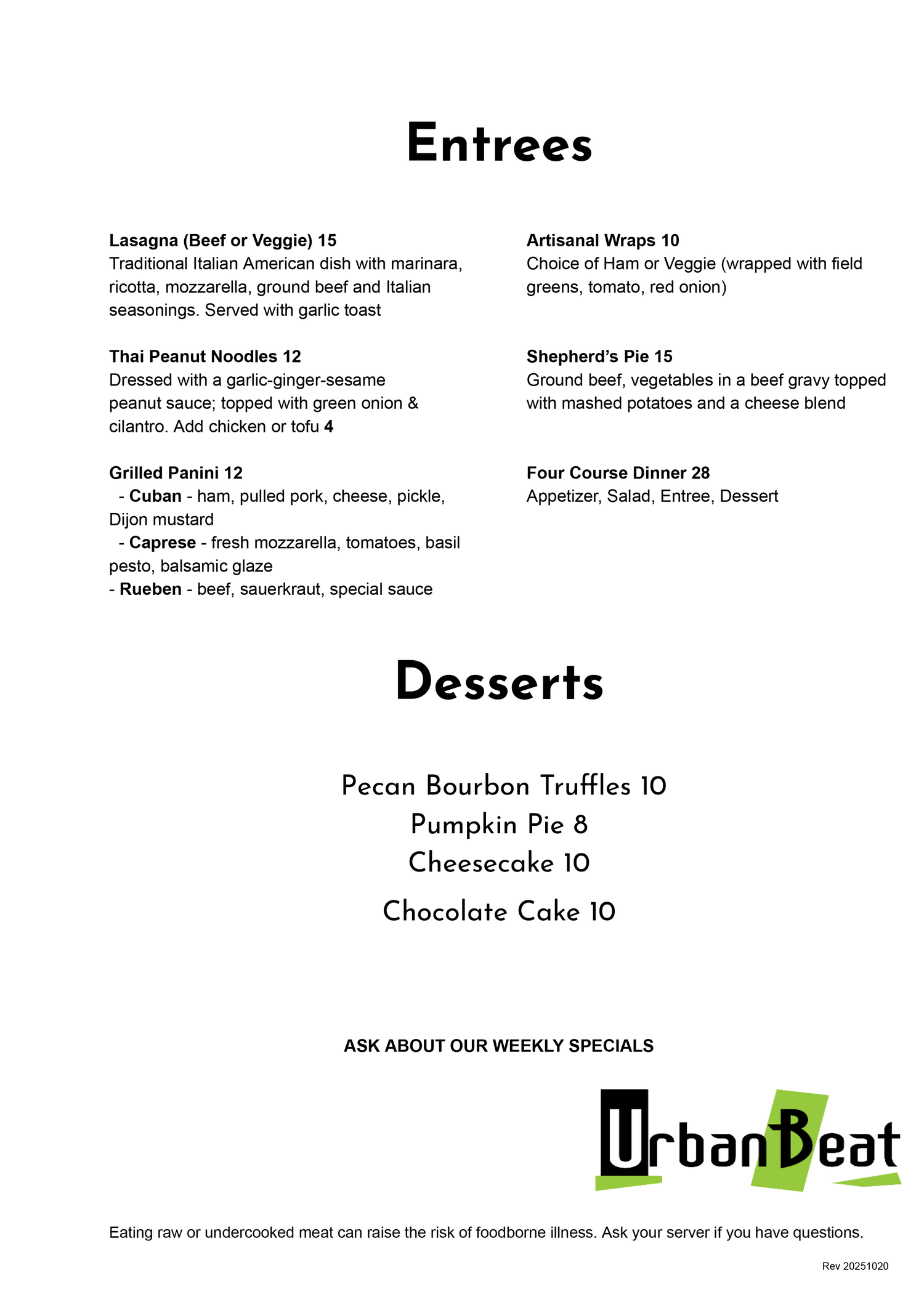 Sip on one of our fan-favorite Craft Cocktails, made with premium spirits and fresh ingredients. UrbanBeat’s charm provides the perfect ambiance for savoring handcrafted and vintage cocktails.